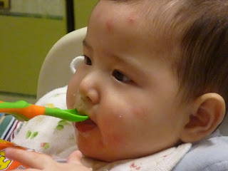 Let's see, we have tried carrots, congee, bananas, sweet potatoes, rice milk, and small melty snacks for kids (similar to rice puffs). We also add in nutritional supplements to make sure he will be as big as dad (or bigger), much to mom's worry. His favorites so far seems to be the bananas and sweet potatoes, so we have to hustle with those since he often looks like a little bird with a wide open mouth waiting for the mother bird's meal.